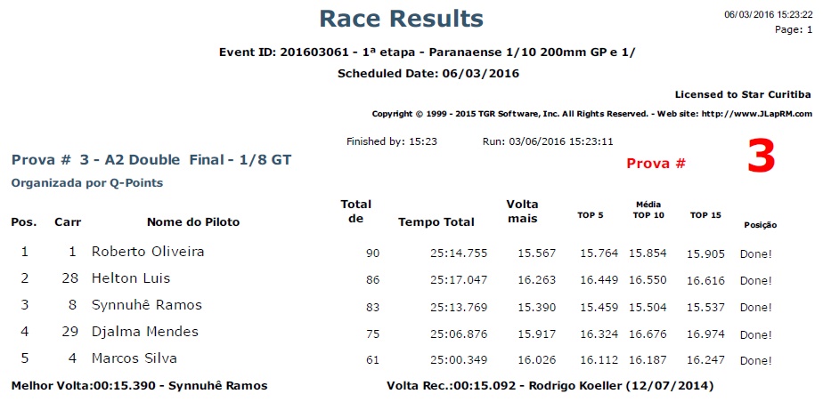 Parabéns ao Edson Lima por esta vitória na 1ª etapa e a todos os participantes, tanto da GT como da 1/10, que abrilhantaram este evento da CAAR.